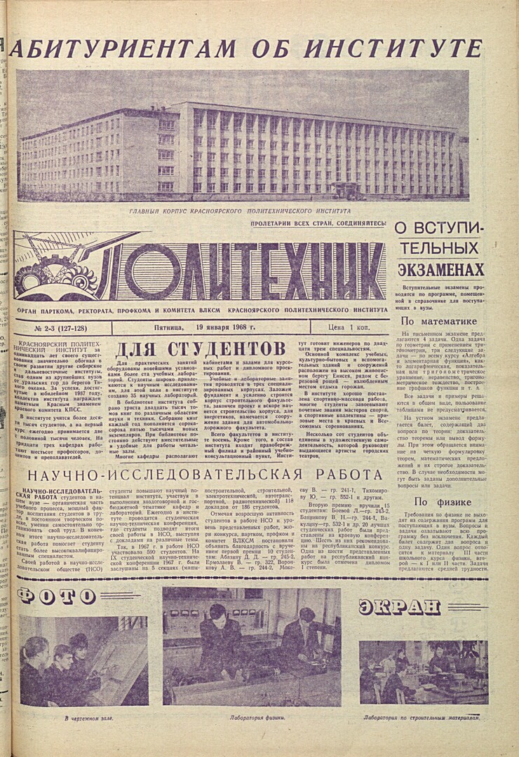Политехник : газета. 1968 г. № 2/3 (127-128) (19 января)