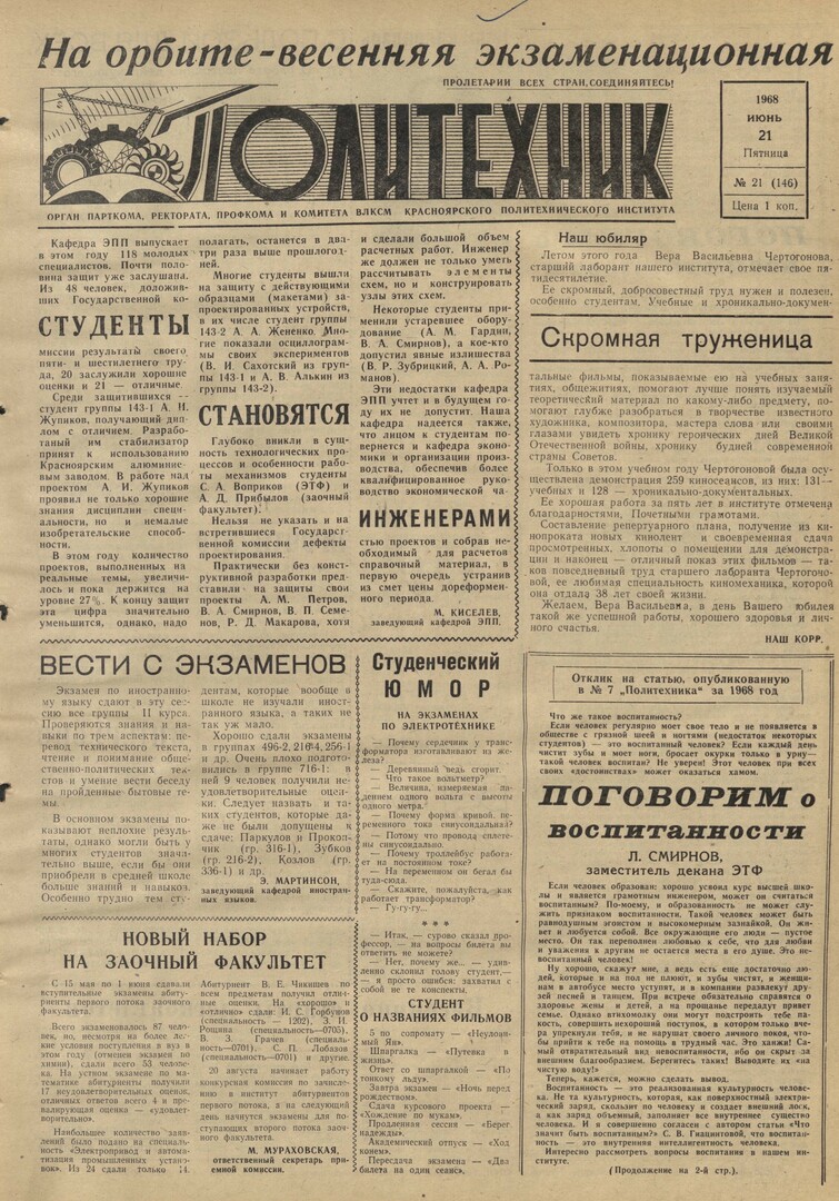 Политехник : газета. 1968 г. № 21 (146) (21 июня)