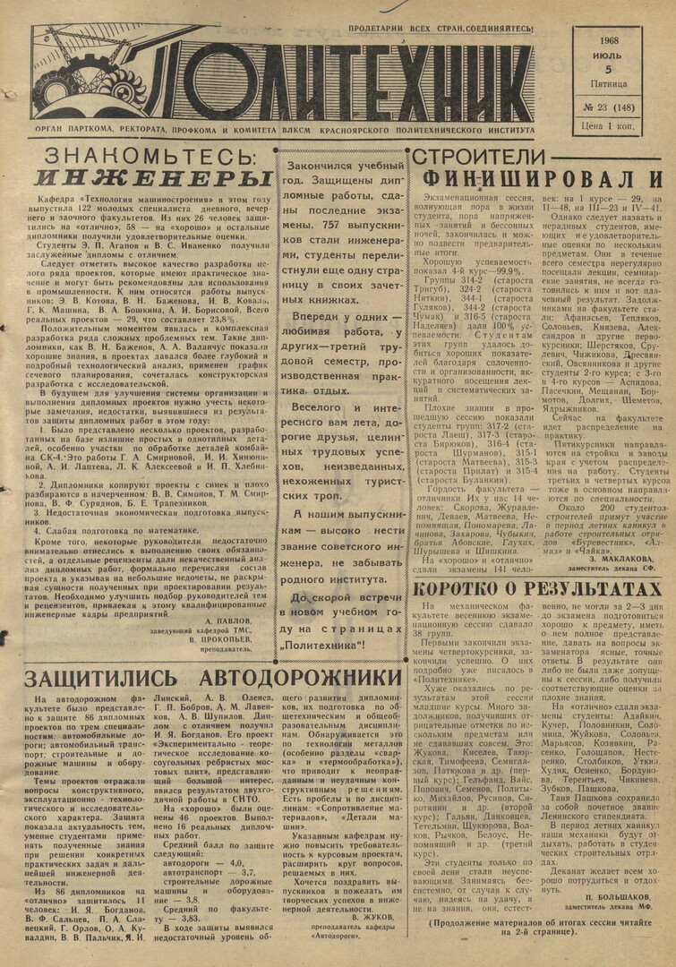 Политехник : газета. 1968 г. № 23 (148) (5 июля)