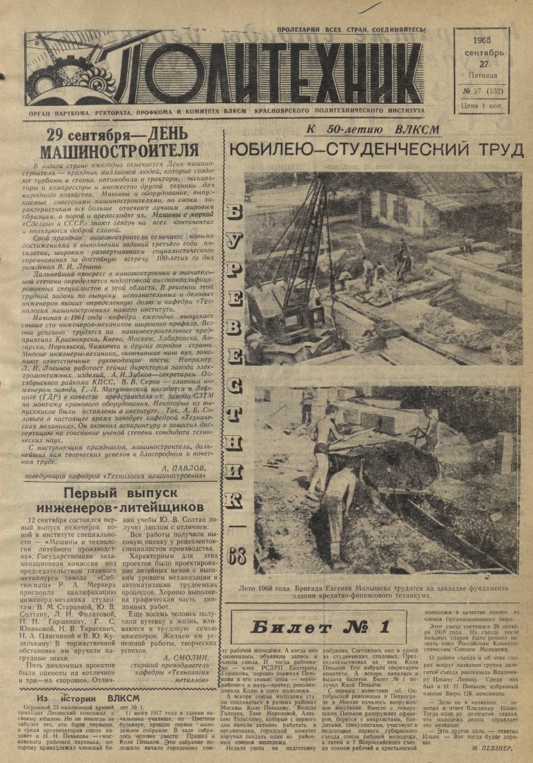 Политехник : газета. 1968 г. № 27 (152) (27 сентября)