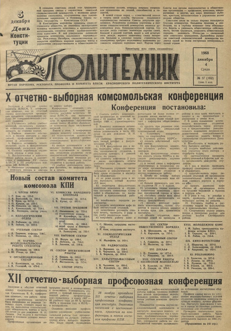 Политехник : газета. 1968 г. № 37 (162) (4 декабря)