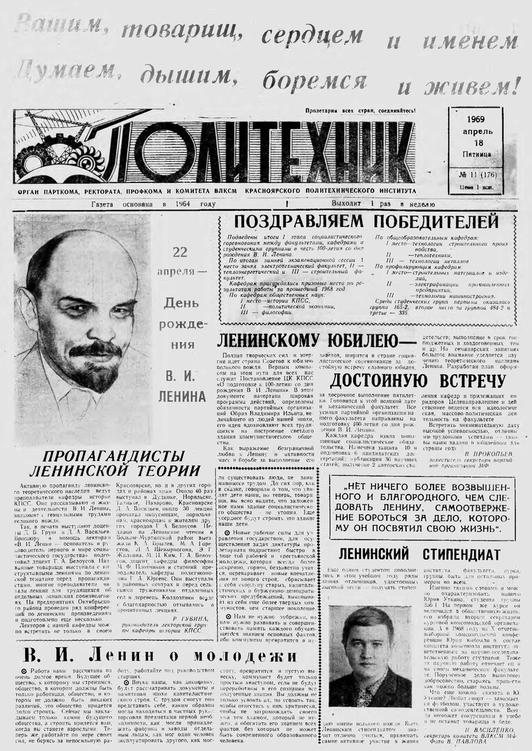 Политехник : газета/ Краснояр. политех. ин-т. - Красноярск : КГТУ, 1964 - - 2006 1969г. N 11 (176) (18 апреля) http://lib3.sfu-kras.ru/ft/LIB2/ELIB_DC/SFUPRSV/sfupol/1969/1969_04_18_0176.pdf