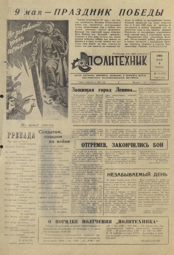 Политехник : газета/ Краснояр. политех. ин-т. - Красноярск : КГТУ, 1964 - - 2006 1969г. N 13 (178) (8 мая) http://lib3.sfu-kras.ru/ft/LIB2/ELIB_DC/SFUPRSV/sfupol/1969/1969_05_08_0178.pdf
