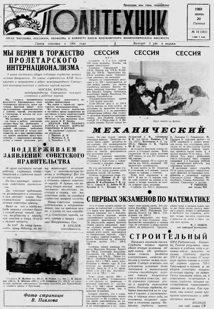 Политехник : газета/ Краснояр. политех. ин-т. - Красноярск : КГТУ, 1964 - - 2006 1969г. N 16 (181) (20 июня) http://lib3.sfu-kras.ru/ft/LIB2/ELIB_DC/SFUPRSV/sfupol/1969/1969_06_20_0181.pdf