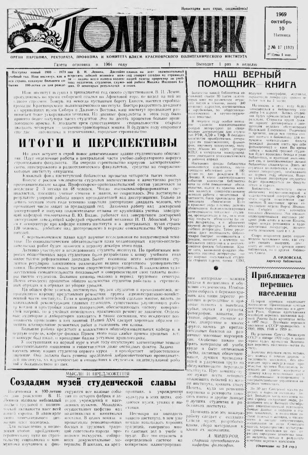 Политехник : газета/ Краснояр. политех. ин-т. - Красноярск : КГТУ, 1964 - - 2006 1969г. N 17 (182) (10 октября) http://lib3.sfu-kras.ru/ft/LIB2/ELIB_DC/SFUPRSV/sfupol/1969/1969_10_10_0182.pdf