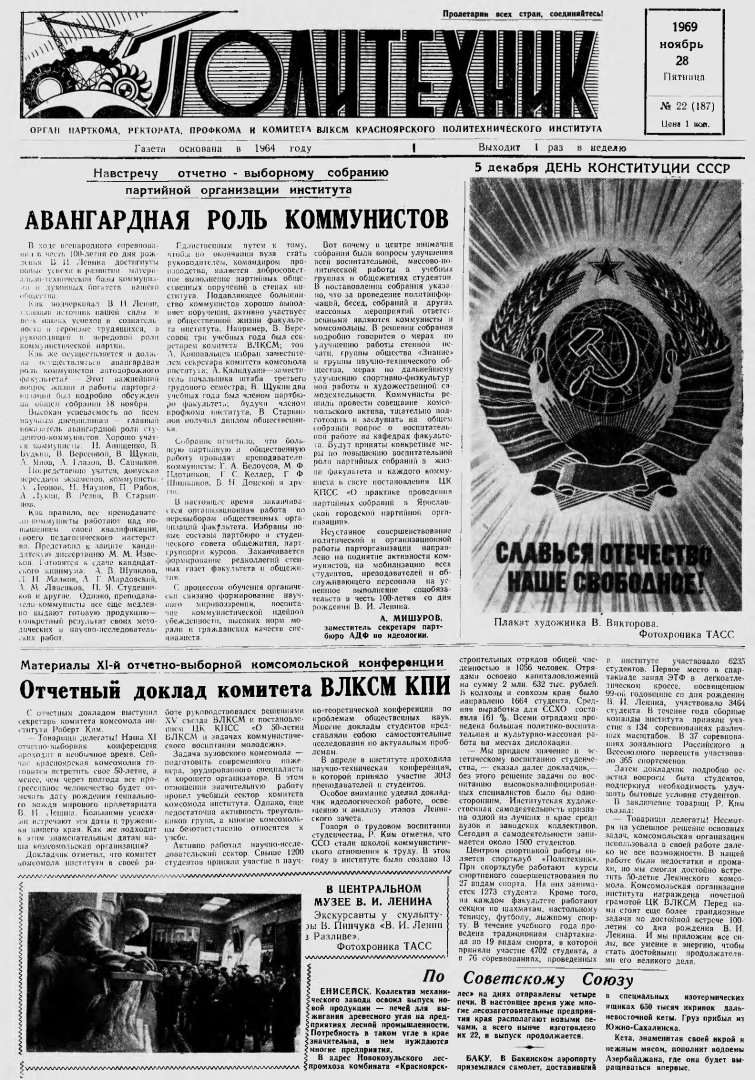 Политехник : газета/ Краснояр. политех. ин-т. - Красноярск : КГТУ, 1964 - - 2006 1969г. N 22 (187) (28 ноября) http://lib3.sfu-kras.ru/ft/LIB2/ELIB_DC/SFUPRSV/sfupol/1969/1969_11_28_0187.pdf