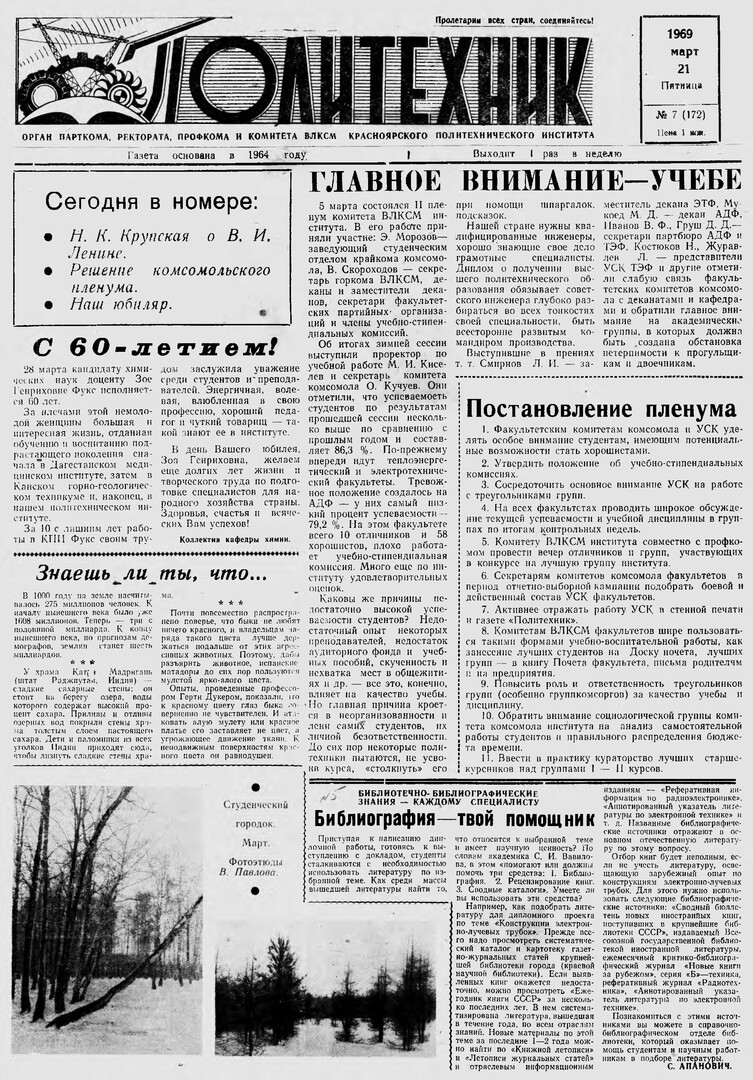 Политехник : газета/ Краснояр. политех. ин-т. - Красноярск : КГТУ, 1964 - - 2006 1969г. N 7 (172) (21 марта) http://lib3.sfu-kras.ru/ft/LIB2/ELIB_DC/SFUPRSV/sfupol/1969/1969_03_21_0172.pdf