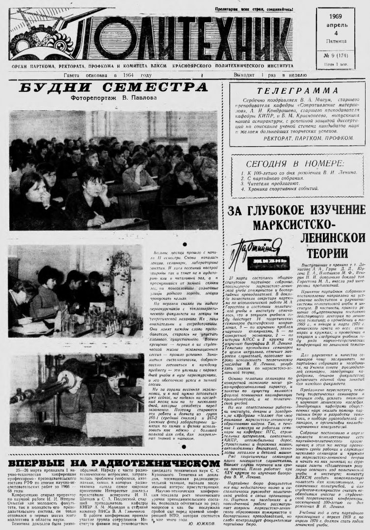 Политехник : газета/ Краснояр. политех. ин-т. - Красноярск : КГТУ, 1964 - - 2006 1969г. N 9 (174) (4 апреля) http://lib3.sfu-kras.ru/ft/LIB2/ELIB_DC/SFUPRSV/sfupol/1969/1969_04_04_0174.pdf