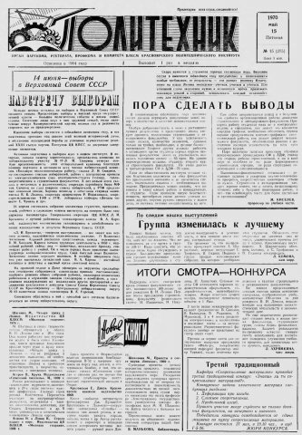 Политехник : газета/ Краснояр. политех. ин-т. - Красноярск : КГТУ, 1964 - - 2006 1970г. N 15 (205) (15 мая) http://lib3.sfu-kras.ru/ft/LIB2/ELIB_DC/SFUPRSV/sfupol/1970/1970_05_15_0205.pdf
