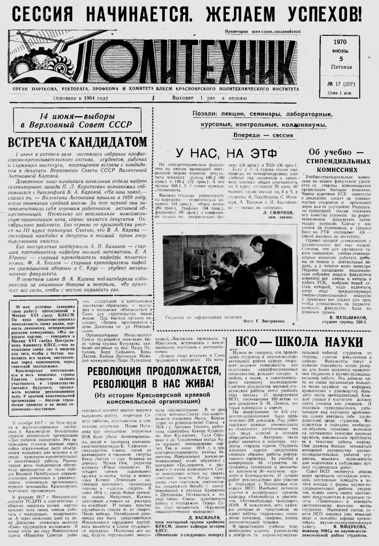 Политехник : газета/ Краснояр. политех. ин-т. - Красноярск : КГТУ, 1964 - - 2006 1970г. N 17 (207) (5 июня) http://lib3.sfu-kras.ru/ft/LIB2/ELIB_DC/SFUPRSV/sfupol/1970/1970_06_05_0207.pdf
