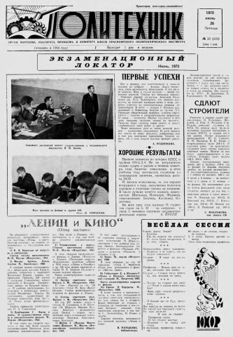 Политехник : газета/ Краснояр. политех. ин-т. - Красноярск : КГТУ, 1964 - - 2006 1970г. N 20 (210) (26 июня) http://lib3.sfu-kras.ru/ft/LIB2/ELIB_DC/SFUPRSV/sfupol/1970/1970_06_26_0210.pdf