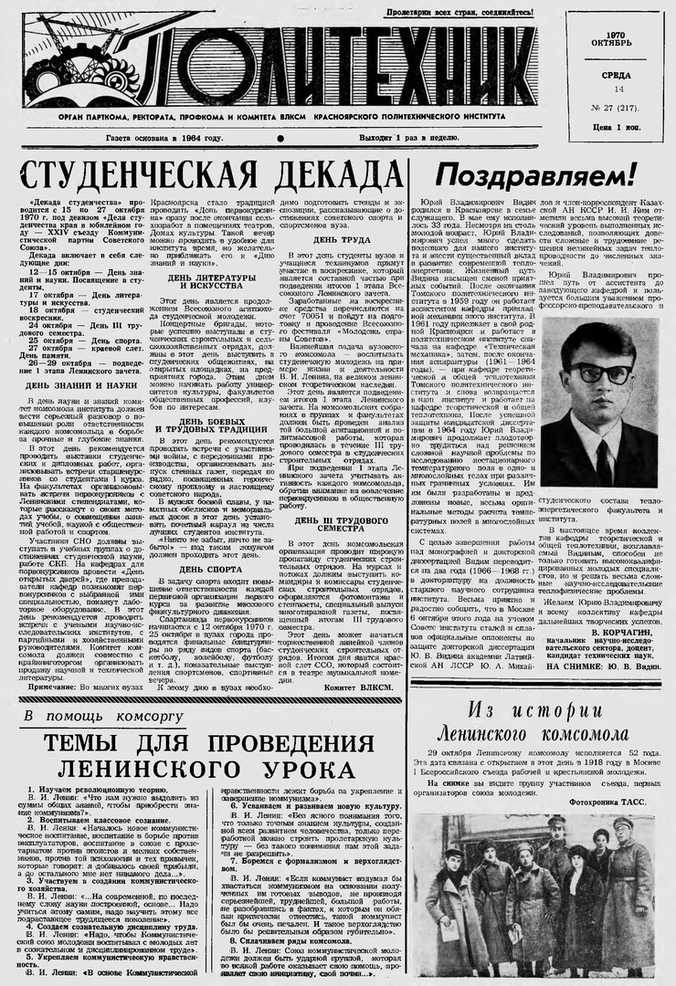Политехник : газета. 1970 г. № 27 (217) (14 октября)