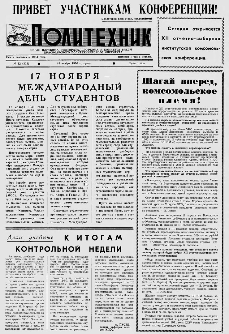 Политехник : газета/ Краснояр. политех. ин-т. - Красноярск : КГТУ, 1964 - - 2006 1970г. N 32 (222) (18 ноября) http://lib3.sfu-kras.ru/ft/LIB2/ELIB_DC/SFUPRSV/sfupol/1970/1970_11_18_0222.pdf