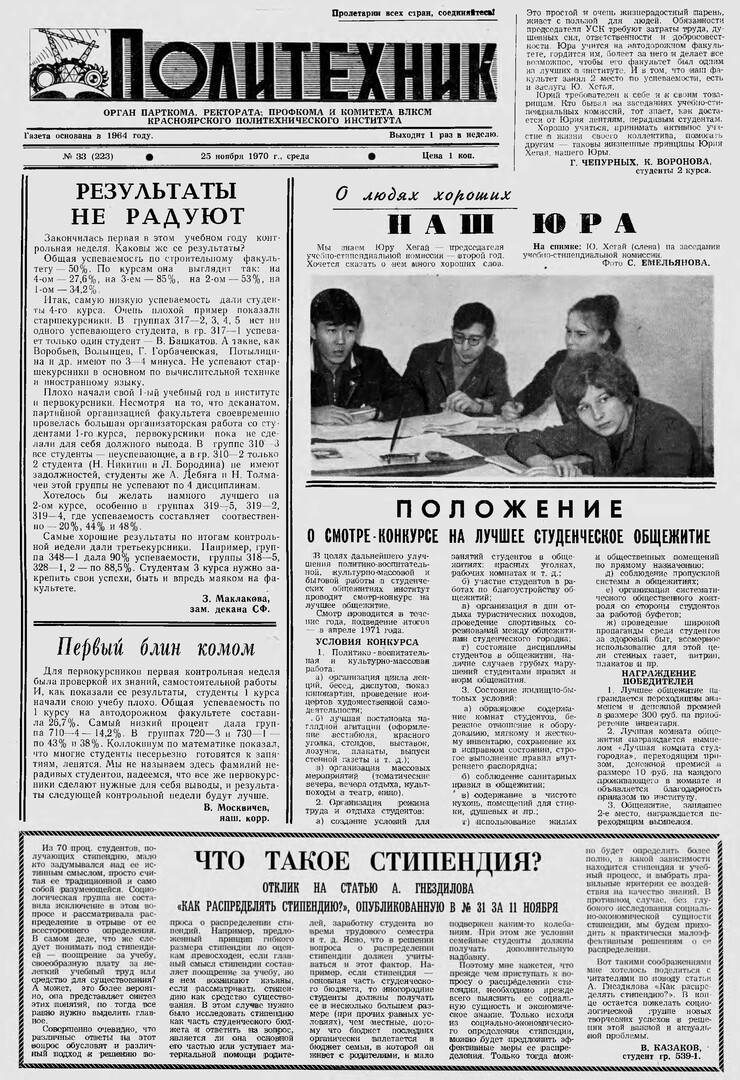 Политехник : газета/ Краснояр. политех. ин-т. - Красноярск : КГТУ, 1964 - - 2006 1970г. N 33 (223) (25 ноября) http://lib3.sfu-kras.ru/ft/LIB2/ELIB_DC/SFUPRSV/sfupol/1970/1970_11_25_0223.pdf