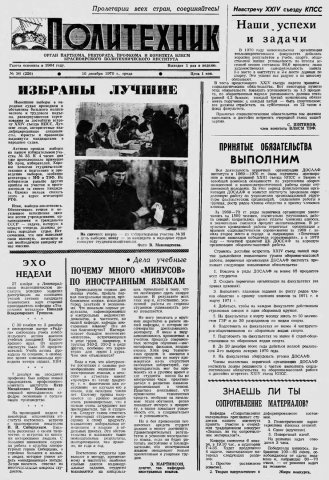Политехник : газета/ Краснояр. политех. ин-т. - Красноярск : КГТУ, 1964 - - 2006 1970г. N 36 (226) (16 декабря) http://lib3.sfu-kras.ru/ft/LIB2/ELIB_DC/SFUPRSV/sfupol/1970/1970_12_16_0226.pdf