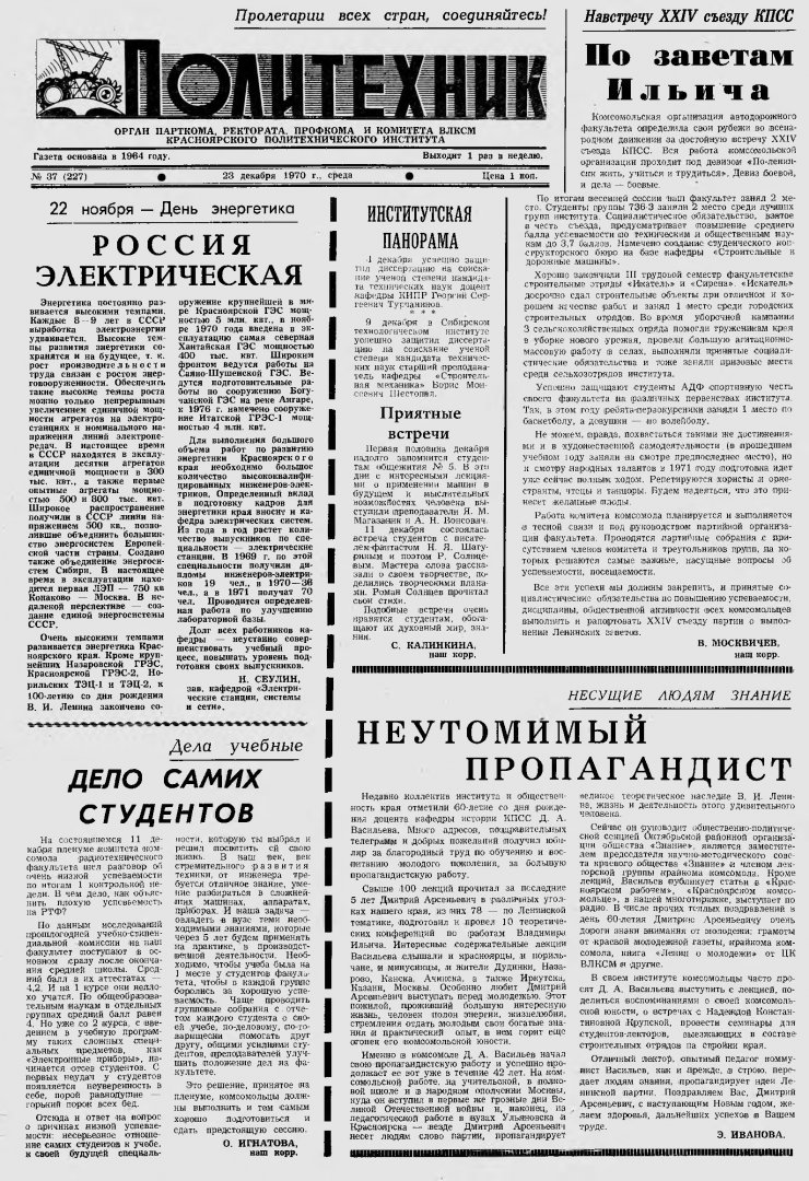 Политехник : газета/ Краснояр. политех. ин-т. - Красноярск : КГТУ, 1964 - - 2006 1970г. N 37 (227) (23 декабря) http://lib3.sfu-kras.ru/ft/LIB2/ELIB_DC/SFUPRSV/sfupol/1970/1970_12_23_0227.pdf