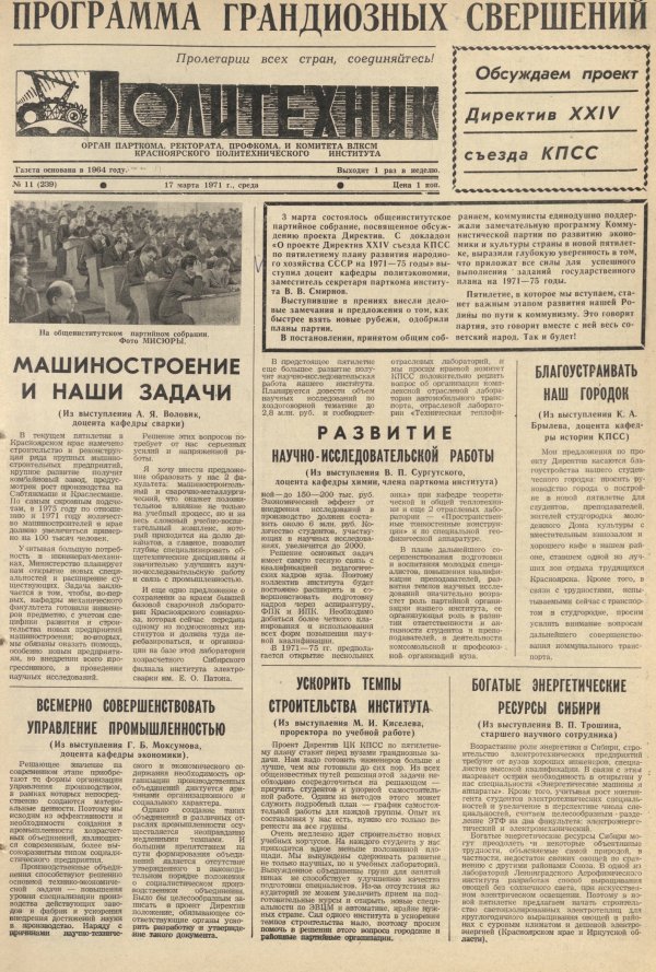 Политехник : газета/ Краснояр. политех. ин-т. - Красноярск : КГТУ, 1964 - - 2006 1971г. N 11 (239) (17 марта) http://lib3.sfu-kras.ru/ft/LIB2/ELIB_DC/SFUPRSV/sfupol/1971/1971_03_17_0239.pdf Держатели документа: Государственная универсальная научная библиотека Красноярского края