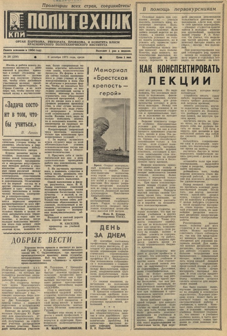 Политехник : газета. 1971 г. № 28 (256) (6 октября)