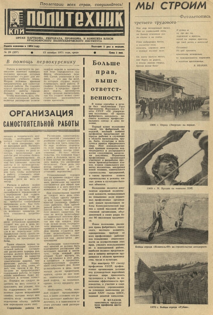 Политехник : газета. 1971 г. № 29 (257) (13 октября)