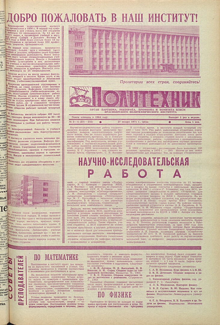 Политехник : газета. 1971 г. № 3/4 (231-232) (27 января)
