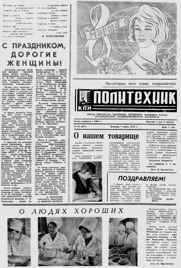 Политехник : газета/ Краснояр. политех. ин-т. - Красноярск : КГТУ, 1964 - - 2006 1972г. N 10 (277) (7 марта) http://lib3.sfu-kras.ru/ft/LIB2/ELIB_DC/SFUPRSV/sfupol/1972/1972_03_07_0277.pdf
