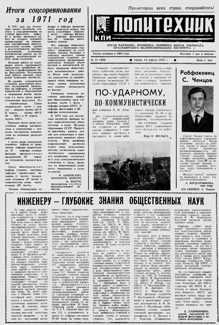 Политехник : газета/ Краснояр. политех. ин-т. - Красноярск : КГТУ, 1964 - - 2006 1972г. N 15 (282) (12 апреля) http://lib3.sfu-kras.ru/ft/LIB2/ELIB_DC/SFUPRSV/sfupol/1972/1972_04_12_0282.pdf