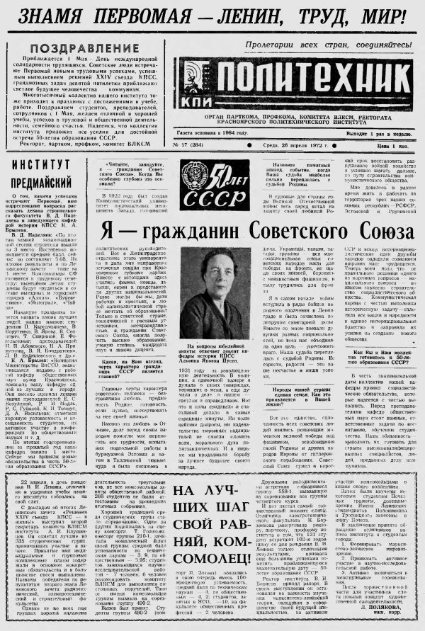 Политехник : газета/ Краснояр. политех. ин-т. - Красноярск : КГТУ, 1964 - - 2006 1972г. N 17 (284) (26 апреля) http://lib3.sfu-kras.ru/ft/LIB2/ELIB_DC/SFUPRSV/sfupol/1972/1972_04_26_0284.pdf