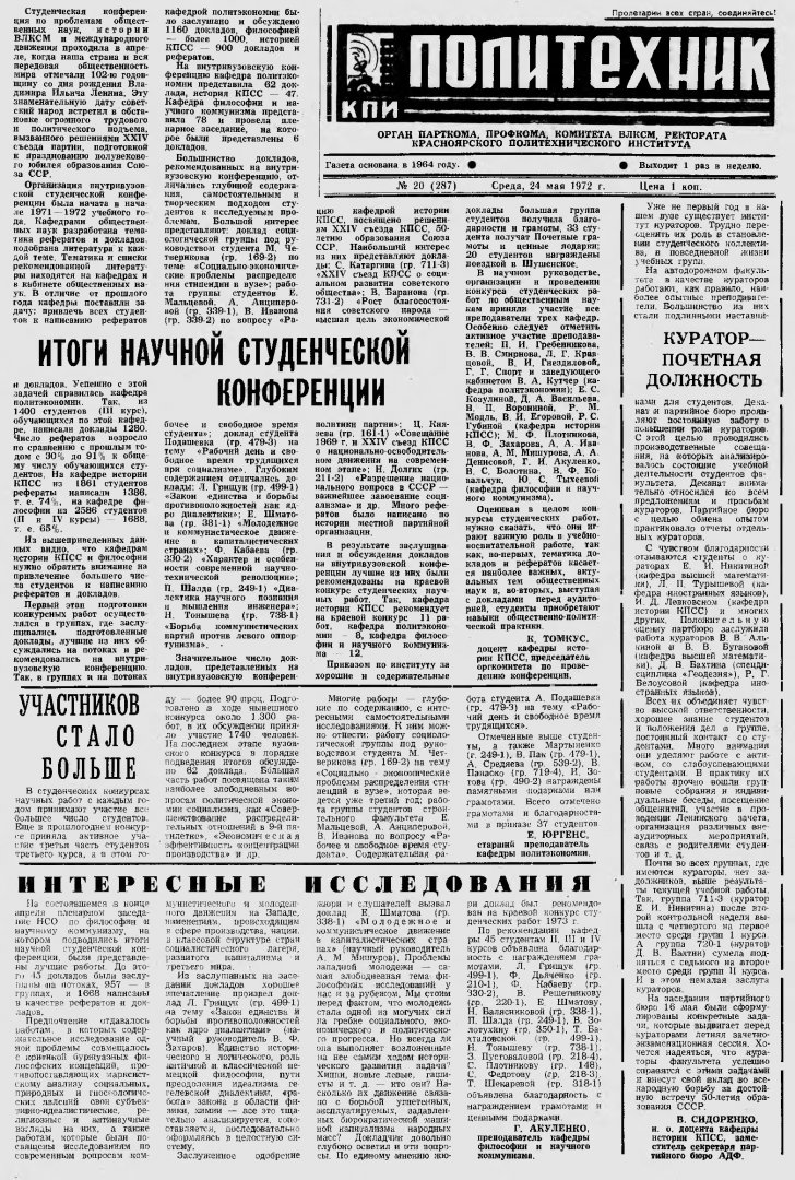 Политехник : газета/ Краснояр. политех. ин-т. - Красноярск : КГТУ, 1964 - - 2006 1972г. N 20 (287) (24 мая) http://lib3.sfu-kras.ru/ft/LIB2/ELIB_DC/SFUPRSV/sfupol/1972/1972_05_24_0287.pdf