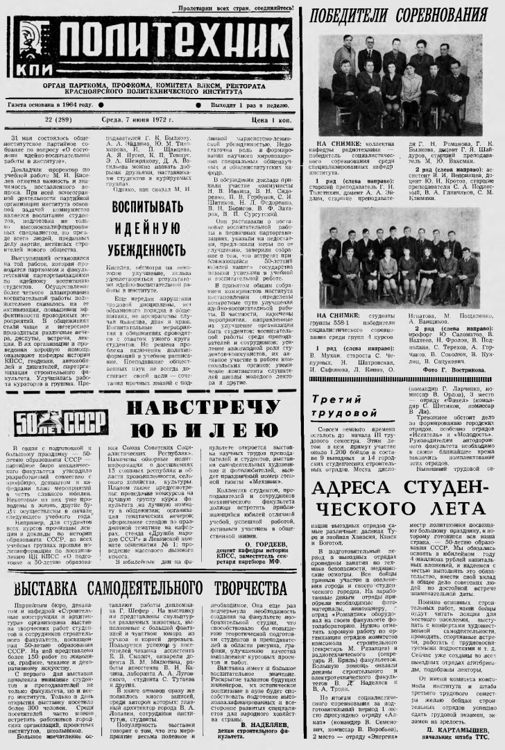 Политехник : газета/ Краснояр. политех. ин-т. - Красноярск : КГТУ, 1964 - - 2006 1972г. N 22 (289) (7 июня) http://lib3.sfu-kras.ru/ft/LIB2/ELIB_DC/SFUPRSV/sfupol/1972/1972_06_07_0289.pdf