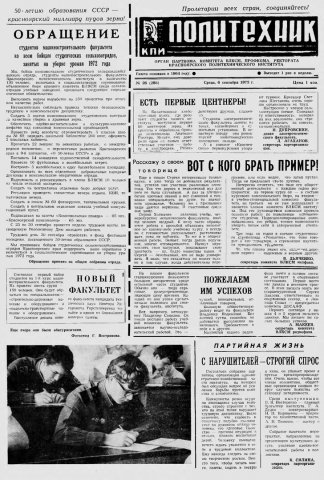 Политехник : газета/ Краснояр. политех. ин-т. - Красноярск : КГТУ, 1964 - - 2006 1972г. N 26 (293) (6 сентября) http://lib3.sfu-kras.ru/ft/LIB2/ELIB_DC/SFUPRSV/sfupol/1972/1972_09_06_0293.pdf