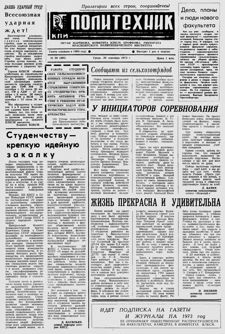 Политехник : газета/ Краснояр. политех. ин-т. - Красноярск : КГТУ, 1964 - - 2006 1972г. N 28 (295) (20 сентября) http://lib3.sfu-kras.ru/ft/LIB2/ELIB_DC/SFUPRSV/sfupol/1972/1972_09_20_0295.pdf