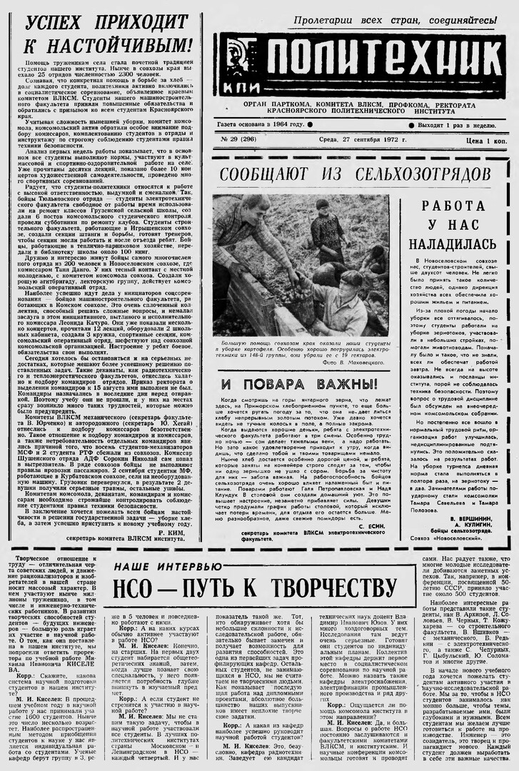 Политехник : газета/ Краснояр. политех. ин-т. - Красноярск : КГТУ, 1964 - - 2006 1972г. N 29 (296) (27 сентября) http://lib3.sfu-kras.ru/ft/LIB2/ELIB_DC/SFUPRSV/sfupol/1972/1972_09_27_0296.pdf