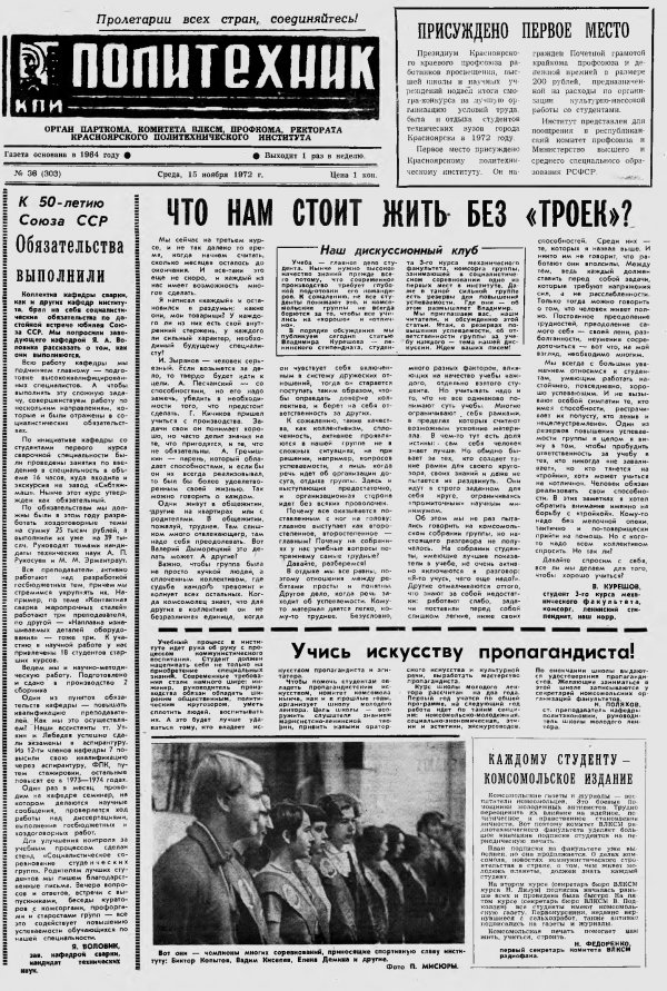 Политехник : газета/ Краснояр. политех. ин-т. - Красноярск : КГТУ, 1964 - - 2006 1972г. N 36 (303) (15 ноября) http://lib3.sfu-kras.ru/ft/LIB2/ELIB_DC/SFUPRSV/sfupol/1972/1972_11_15_0303.pdf