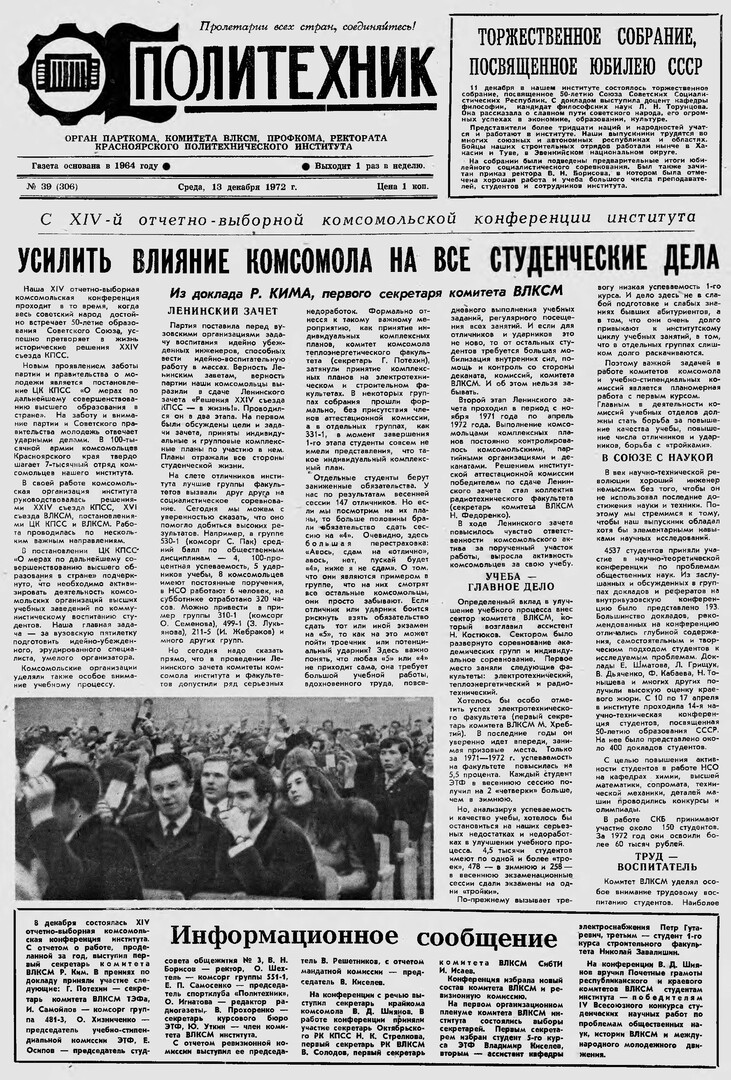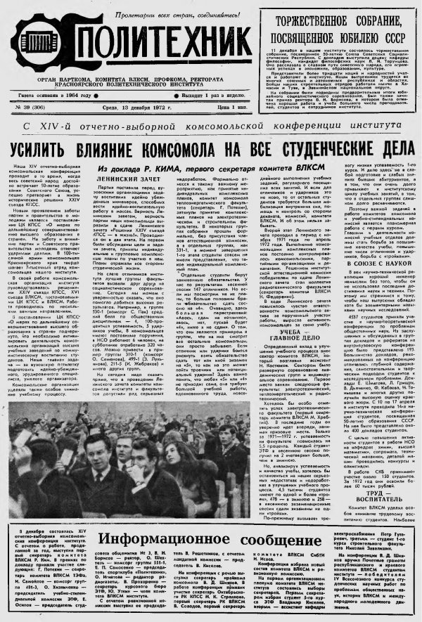 Политехник : газета/ Краснояр. политех. ин-т. - Красноярск : КГТУ, 1964 - - 2006 1972г. N 39 (306) (13 декабря) http://lib3.sfu-kras.ru/ft/LIB2/ELIB_DC/SFUPRSV/sfupol/1972/1972_12_13_0306.pdf