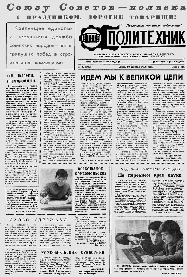 Политехник : газета/ Краснояр. политех. ин-т. - Красноярск : КГТУ, 1964 - - 2006 1972г. N 40 (307) (20 декабря) http://lib3.sfu-kras.ru/ft/LIB2/ELIB_DC/SFUPRSV/sfupol/1972/1972_12_20_0307.pdf