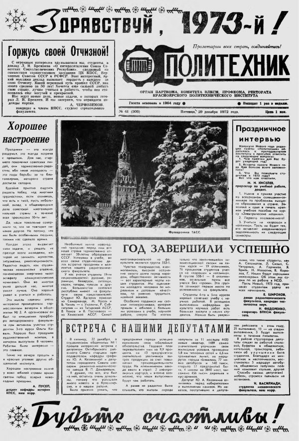 Политехник : газета/ Краснояр. политех. ин-т. - Красноярск : КГТУ, 1964 - - 2006 1972г. N 41 (308) (29 декабря) http://lib3.sfu-kras.ru/ft/LIB2/ELIB_DC/SFUPRSV/sfupol/1972/1972_12_29_0308.pdf