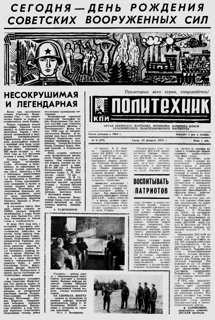 Политехник : газета/ Краснояр. политех. ин-т. - Красноярск : КГТУ, 1964 - - 2006 1972г. N 8 (275) (23 февраля) http://lib3.sfu-kras.ru/ft/LIB2/ELIB_DC/SFUPRSV/sfupol/1972/1972_02_23_0275.pdf