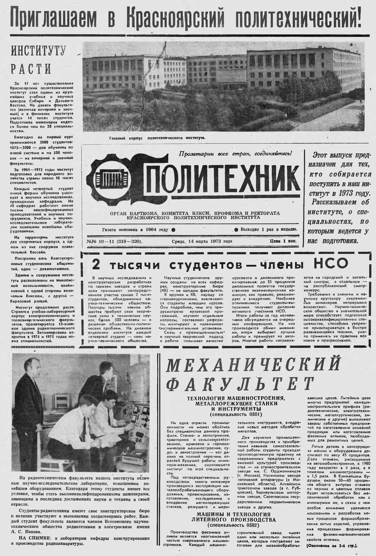 Политехник : газета/ Краснояр. политех. ин-т. - Красноярск : КГТУ, 1964 - - 2006 1973г. N 10/11 (319-320) (14 марта) http://lib3.sfu-kras.ru/ft/LIB2/ELIB_DC/SFUPRSV/sfupol/1973/1973_03_14_0319-0320.pdf
