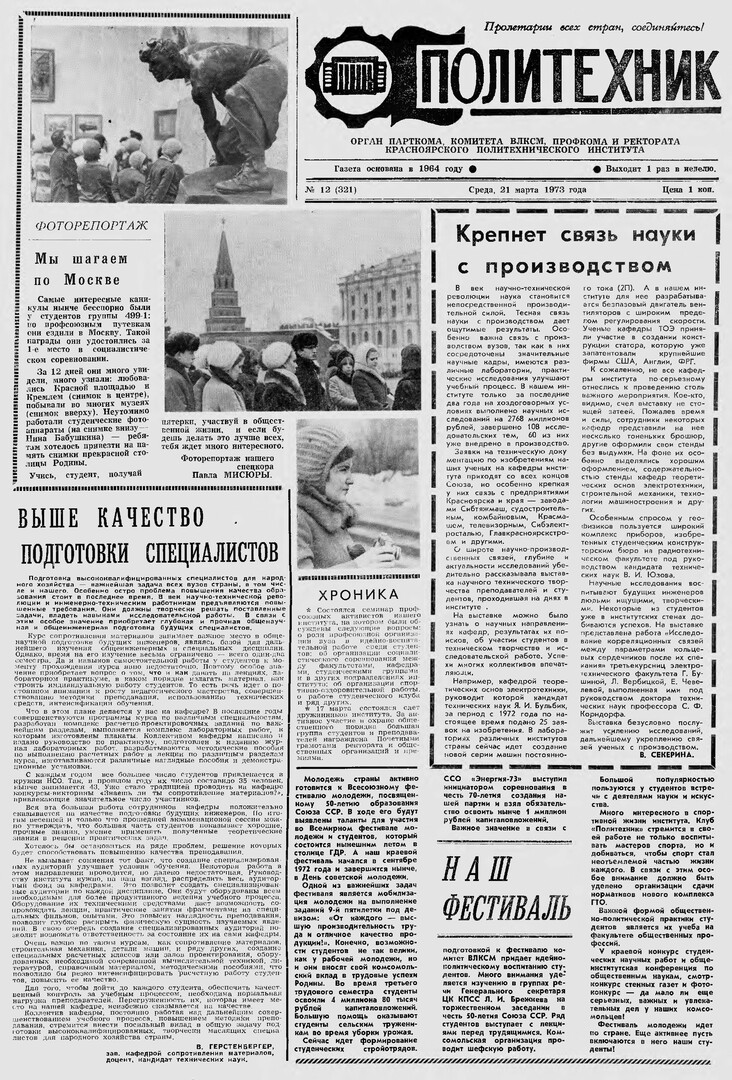 Политехник : газета/ Краснояр. политех. ин-т. - Красноярск : КГТУ, 1964 - - 2006 1973г. N 12 (321) (21 марта) http://lib3.sfu-kras.ru/ft/LIB2/ELIB_DC/SFUPRSV/sfupol/1973/1973_03_21_0321.pdf