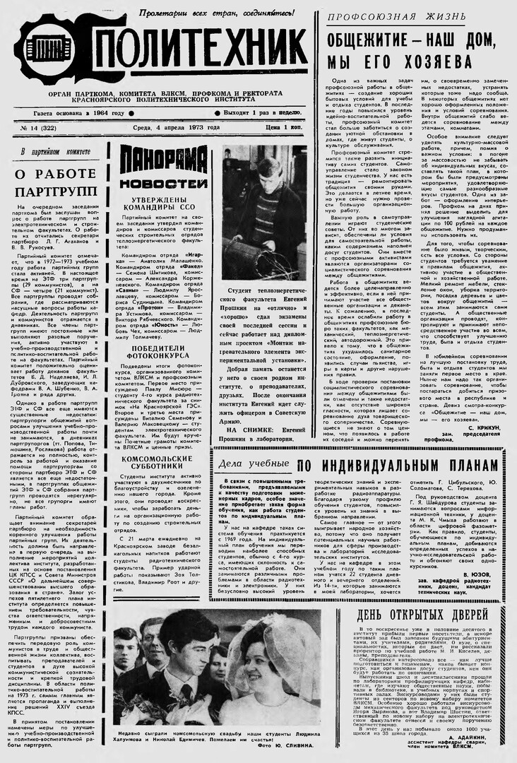 Политехник : газета/ Краснояр. политех. ин-т. - Красноярск : КГТУ, 1964 - - 2006 1973г. N 14 (322) (4 апреля) http://lib3.sfu-kras.ru/ft/LIB2/ELIB_DC/SFUPRSV/sfupol/1973/1973_04_04_0322.pdf