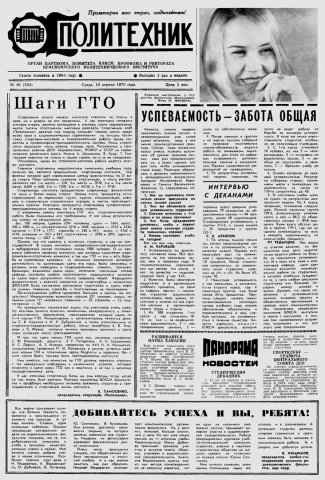 Политехник : газета/ Краснояр. политех. ин-т. - Красноярск : КГТУ, 1964 - - 2006 1973г. N 16 (324) (18 апреля) http://lib3.sfu-kras.ru/ft/LIB2/ELIB_DC/SFUPRSV/sfupol/1973/1973_04_18_0324.pdf