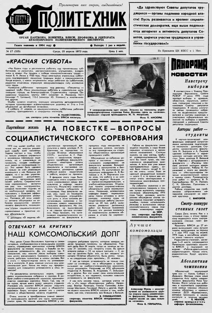 Политехник : газета/ Краснояр. политех. ин-т. - Красноярск : КГТУ, 1964 - - 2006 1973г. N 17 (325) (25 апреля) http://lib3.sfu-kras.ru/ft/LIB2/ELIB_DC/SFUPRSV/sfupol/1973/1973_04_25_0325.pdf