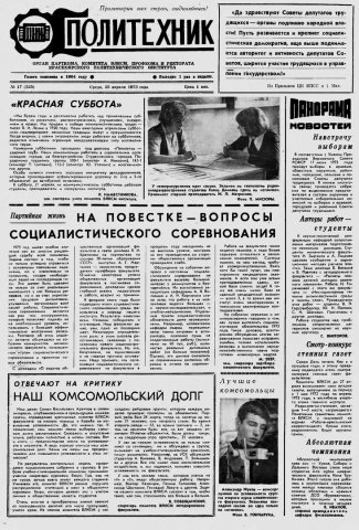 Политехник : газета. 1973 г. № 17 (325) (25 апреля)
