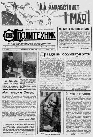 Политехник : газета/ Краснояр. политех. ин-т. - Красноярск : КГТУ, 1964 - - 2006 1973г. N 17* (326) (29 апреля) http://lib3.sfu-kras.ru/ft/LIB2/ELIB_DC/SFUPRSV/sfupol/1973/1973_04_29_0326.pdf