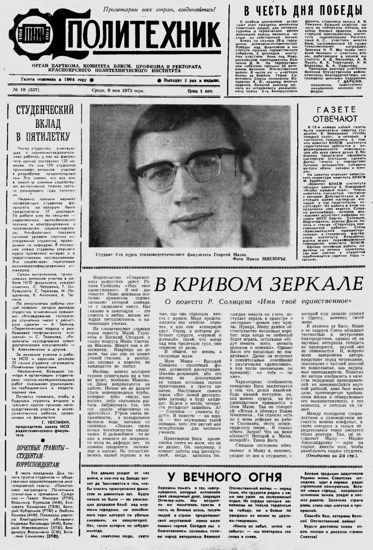 Политехник : газета/ Краснояр. политех. ин-т. - Красноярск : КГТУ, 1964 - - 2006 1973г. N 19 (327) (9 мая) http://lib3.sfu-kras.ru/ft/LIB2/ELIB_DC/SFUPRSV/sfupol/1973/1973_05_09_0327.pdf