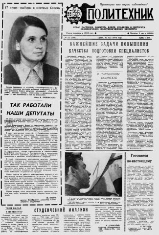 Политехник : газета/ Краснояр. политех. ин-т. - Красноярск : КГТУ, 1964 - - 2006 1973г. N 22 (330) (30 мая) http://lib3.sfu-kras.ru/ft/LIB2/ELIB_DC/SFUPRSV/sfupol/1973/1973_05_30_0330.pdf