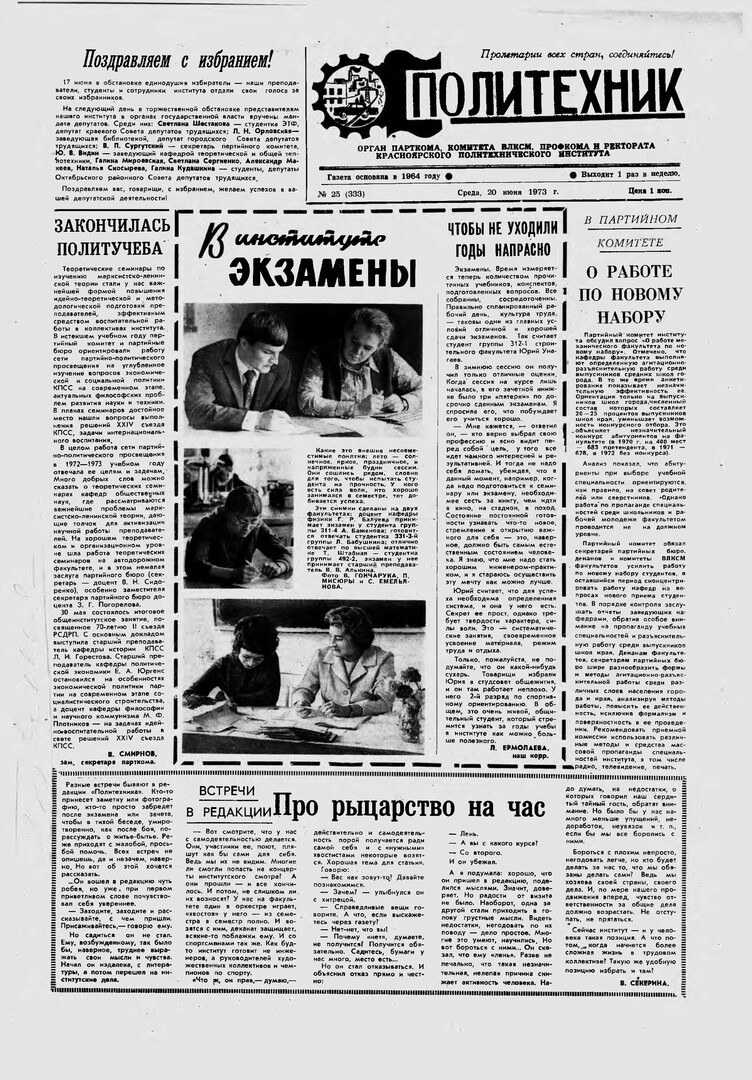 Политехник : газета/ Краснояр. политех. ин-т. - Красноярск : КГТУ, 1964 - - 2006 1973г. N 25 (333) (20 июня) http://lib3.sfu-kras.ru/ft/LIB2/ELIB_DC/SFUPRSV/sfupol/1973/1973_06_20_0333.pdf