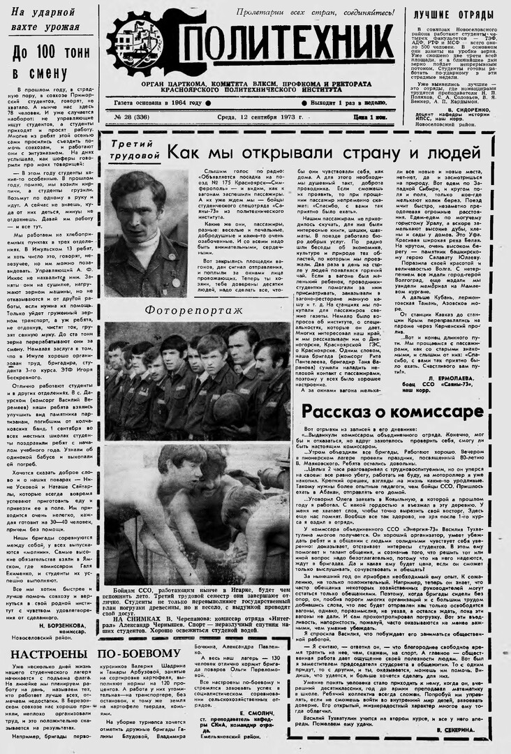 Политехник : газета/ Краснояр. политех. ин-т. - Красноярск : КГТУ, 1964 - - 2006 1973г. N 28 (336) (12 сентября) http://lib3.sfu-kras.ru/ft/LIB2/ELIB_DC/SFUPRSV/sfupol/1973/1973_09_12_0336.pdf