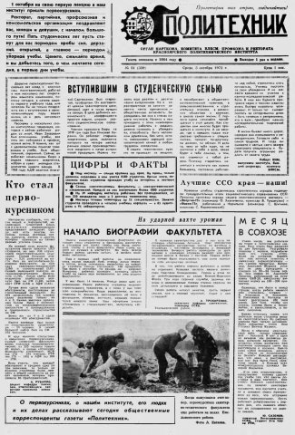 Политехник : газета/ Краснояр. политех. ин-т. - Красноярск : КГТУ, 1964 - - 2006 1973г. N 31 (339) (3 октября) http://lib3.sfu-kras.ru/ft/LIB2/ELIB_DC/SFUPRSV/sfupol/1973/1973_10_03_0339.pdf