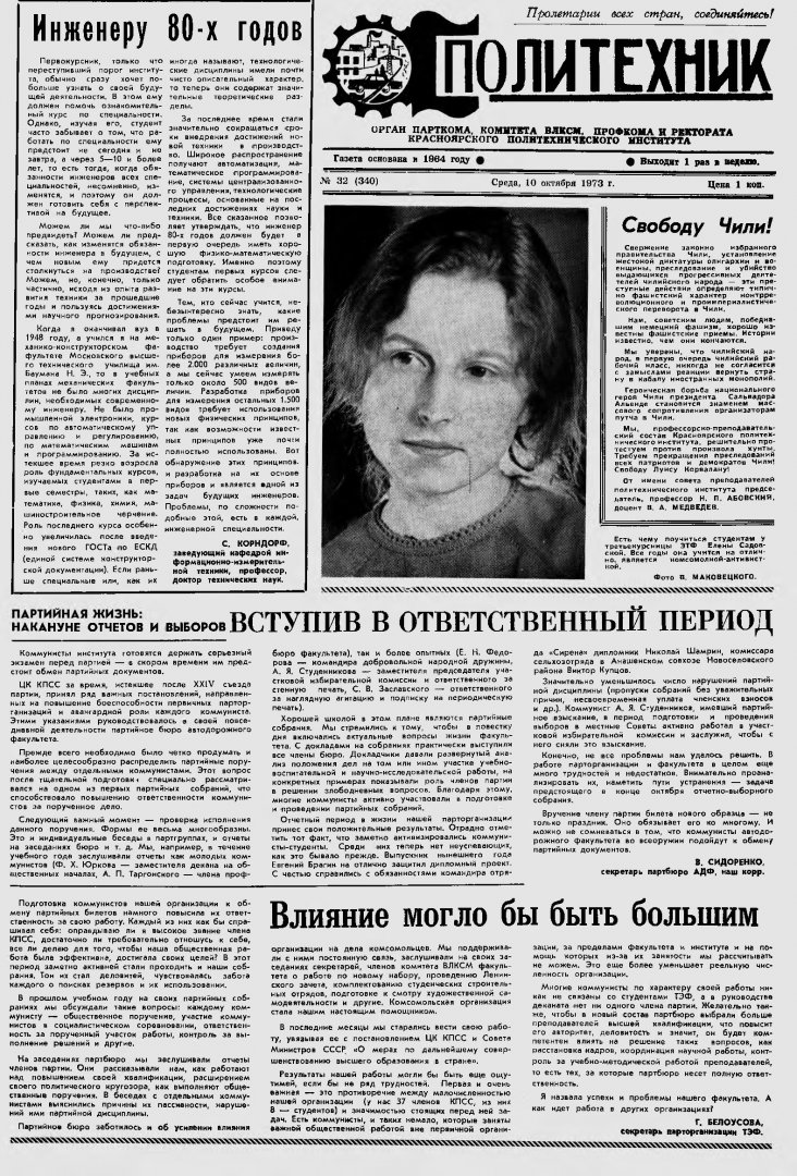Политехник : газета/ Краснояр. политех. ин-т. - Красноярск : КГТУ, 1964 - - 2006 1973г. N 32 (340) (10 октября) http://lib3.sfu-kras.ru/ft/LIB2/ELIB_DC/SFUPRSV/sfupol/1973/1973_10_10_0340.pdf